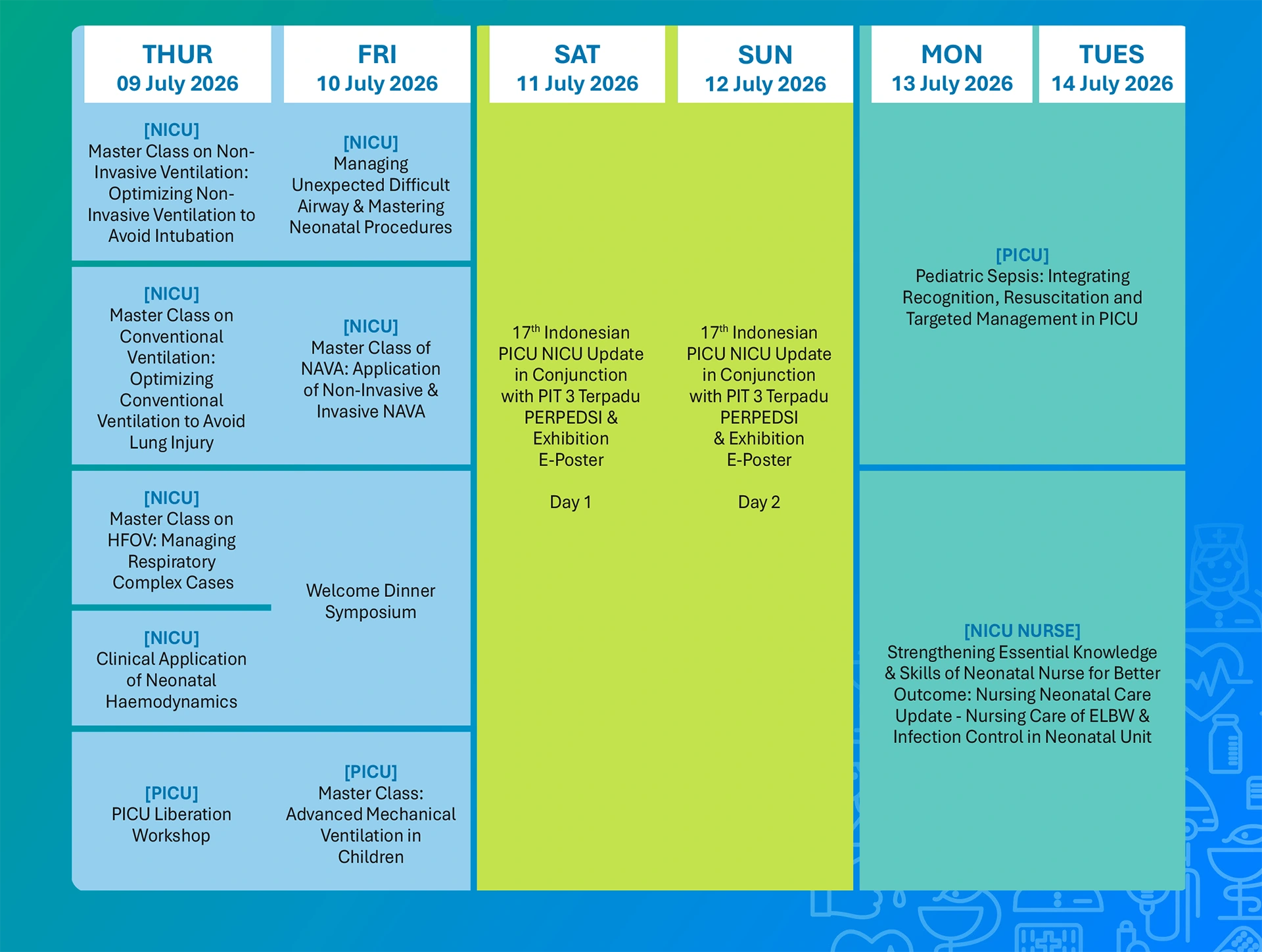 To highlight the significance of this vital component of 17th Indonesian PICU NICU Update in conjunction with PIT 3 Terpadu PERPEDSI 2026, Indonesian PICU NICU Update will feature interactive pre and post symposium workshops. These offline pre-setting workshops held on Thursday – Friday, 09 – 10 July 2026 in Jakarta, which include scientific lectures, case studies with hands-on workshops tailored to enhance practical learning, and post-setting on 13 – 14 July 2026. Detailed schedules are available for further reference.